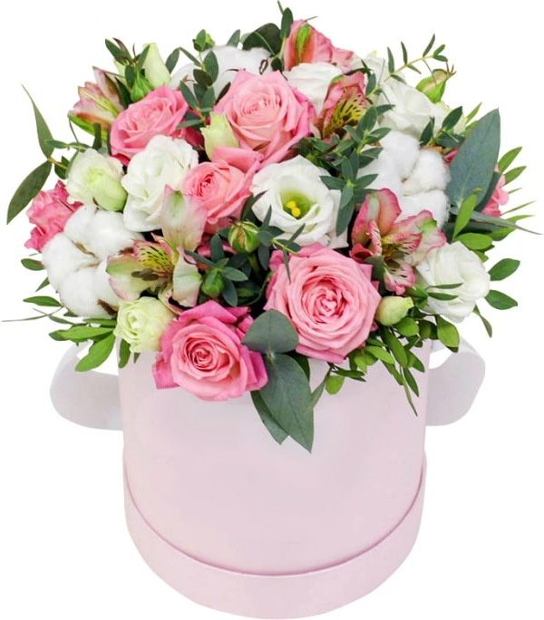 9 розовых роз, 3 альстромерии,3 хлопка, 5 эустомы, зелень, оазис, коробка13 розовых роз,4 альстромерии, 4 хлопка, 7 эустомы, зелень, оазис, коробка